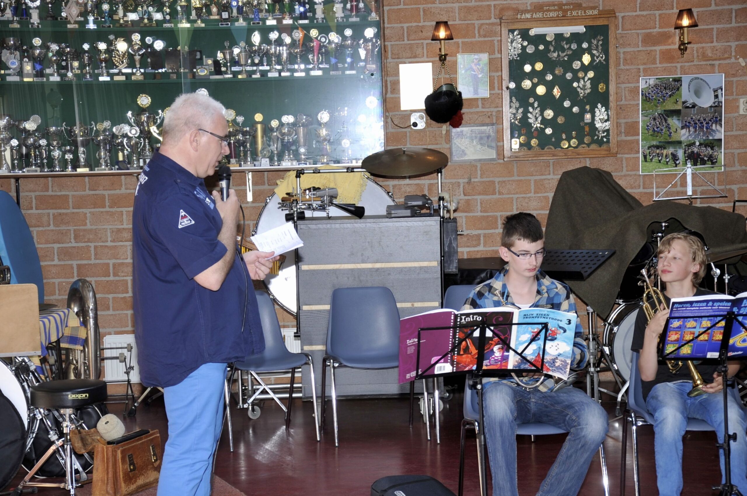 Jong talent wordt dan in de gelegenheid gesteld van zich te laten horen. Zaterdag jl. waren dat Thijs op bugel en Robert op trompet. Samen speelden zij Spannenlanger Hansel en Marching Along. Thijs daarna in z’n eentje de Pink Panter en Fanfare, waarna Robert op trompet Geef…Acht en Kalinka blies. Hun prestaties werden beoordeeld door een heuse vakjury, bestaande uit twee professioneel opgeleide trompettisten, Marc Busscher en Hans van Hees.