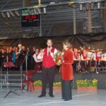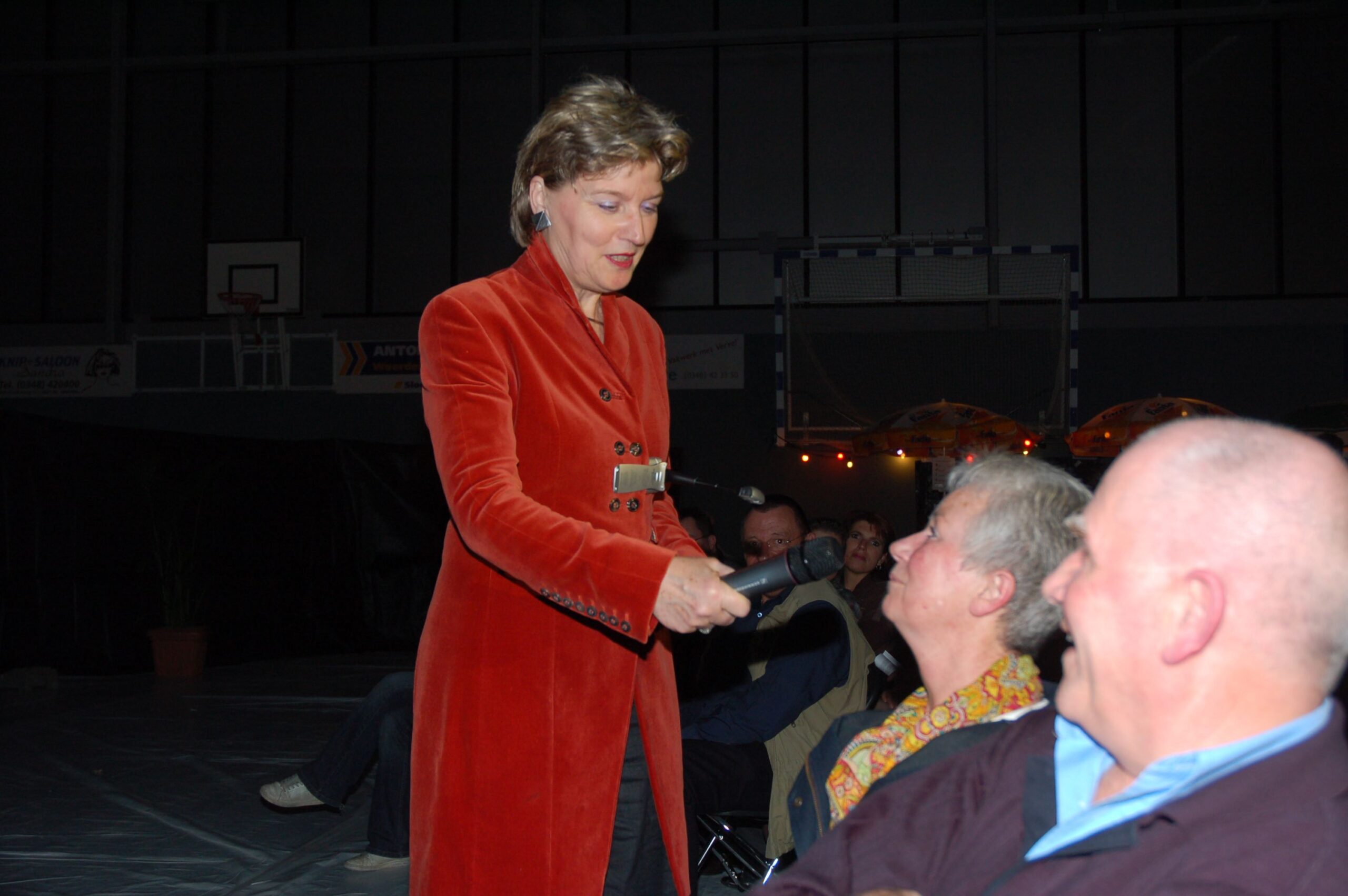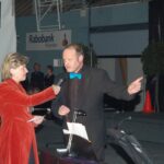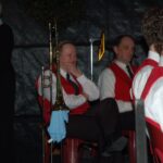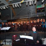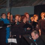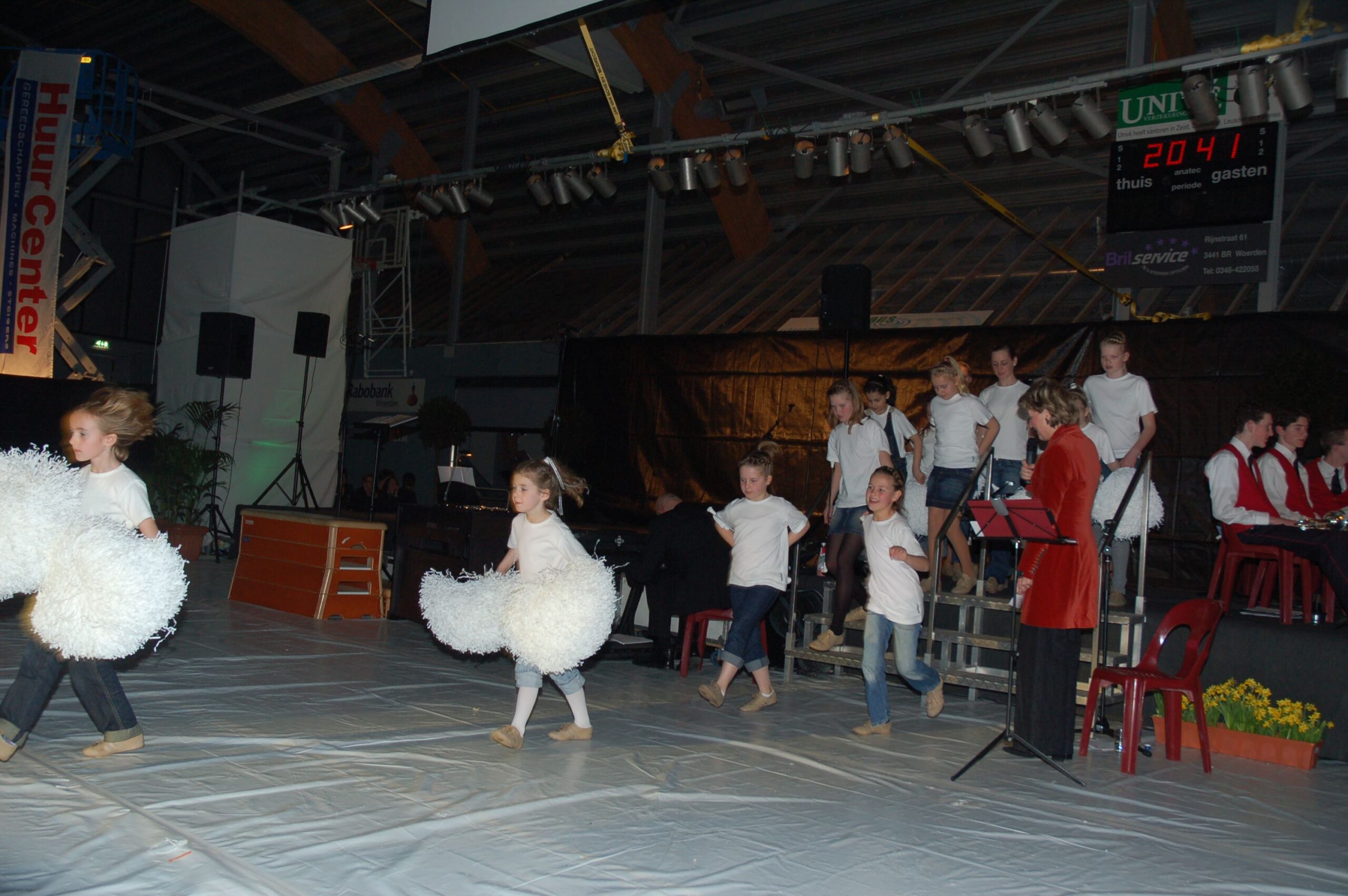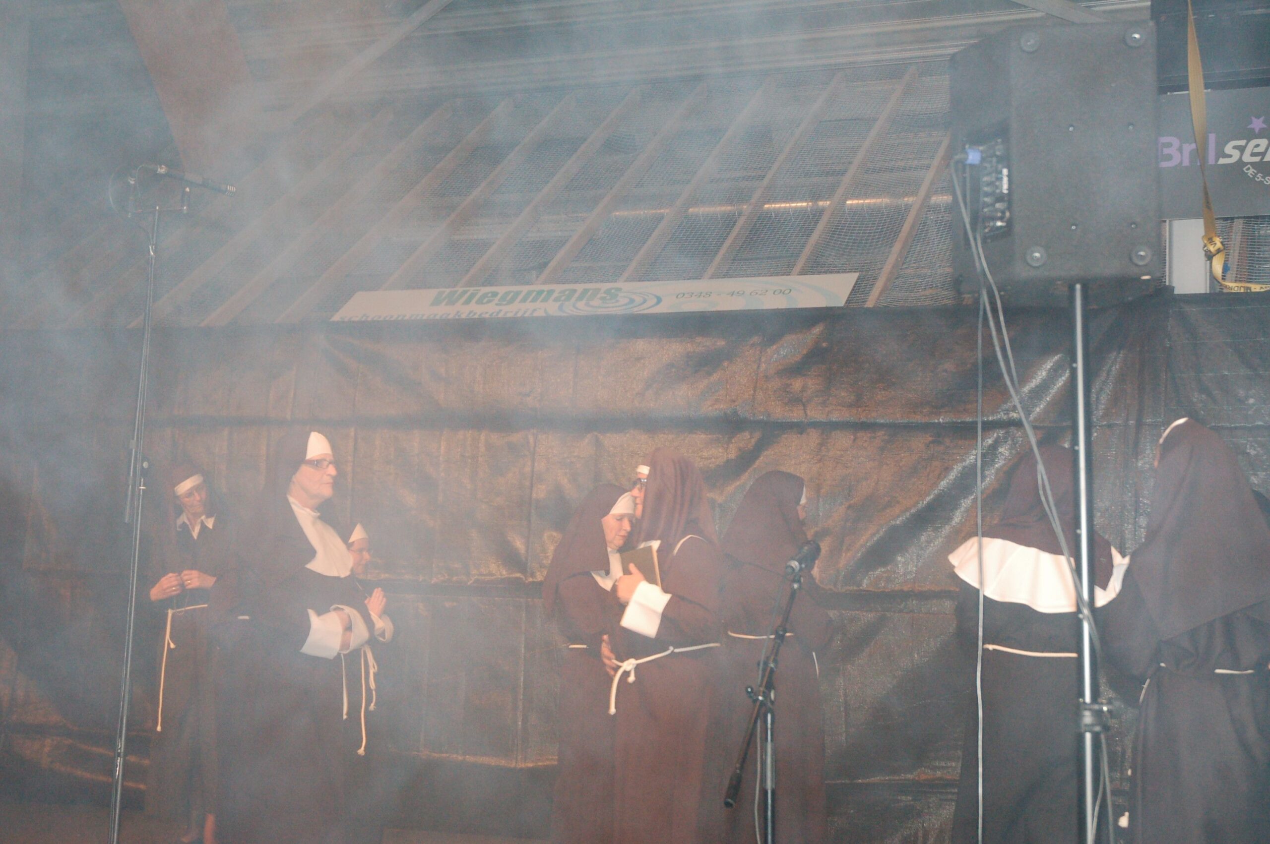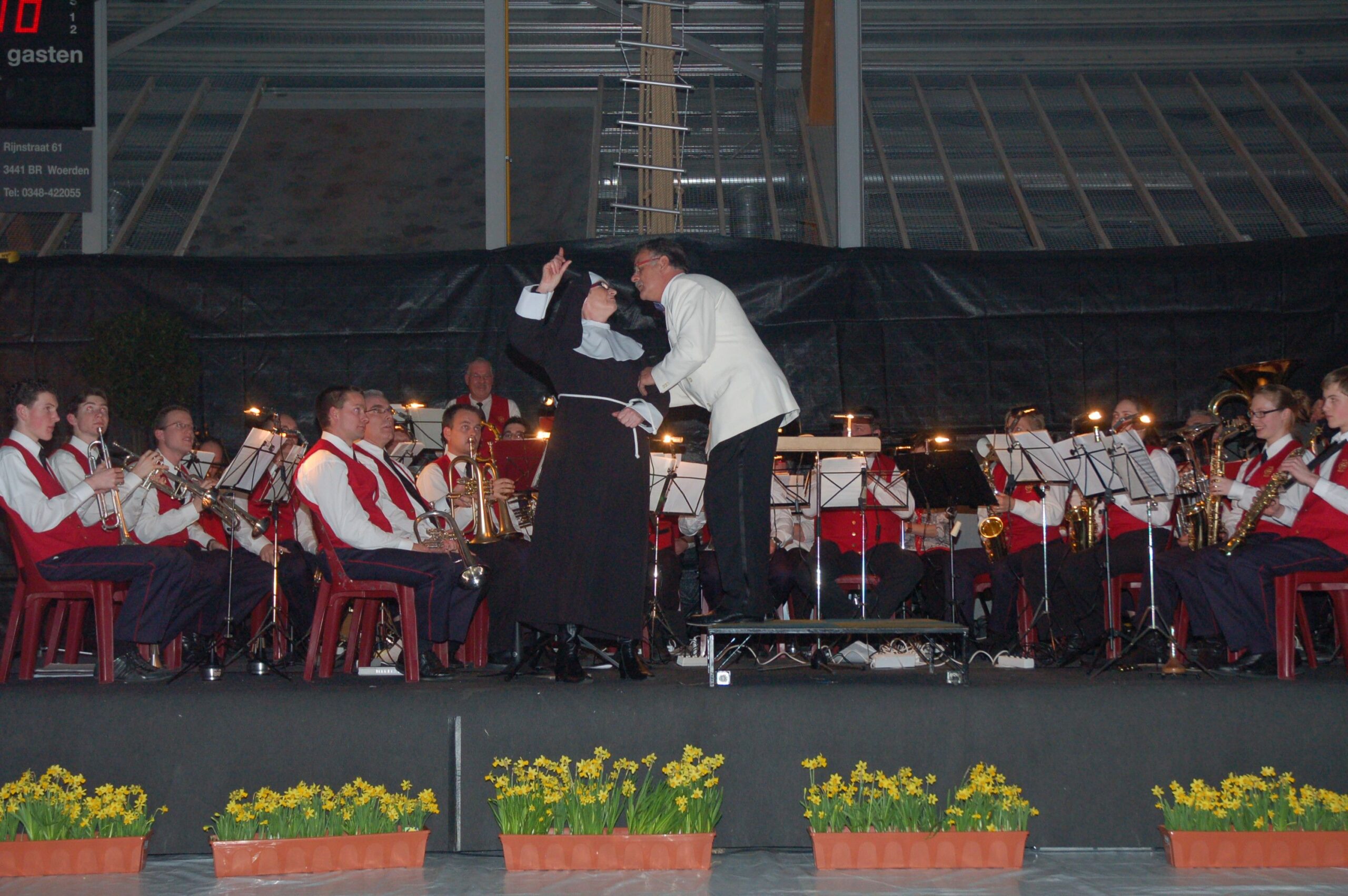 low him uit de film ‘Sister Act’. Omdat Whoopi Goldberg en haar nonnen niet beschikbaar waren had de Promsorganisatie een verrassend alternatief geregeld. Een aantal dames van Koordaat, coöperatief als ze zijn, had zichzelf voor een avond een celibatair leven aangemeten en zich in habijt gestoken. Na hun opkomst op kerkorgelmuziek en het langzame intro van het nummer I will follow him begonnen zich helaas toch wat verveelde blikken af te tekenen op de gezichten van deze nonnen. Moeder overste had echter de regie goed in handen en voelde feilloos aan wat er moest gebeuren. Zij stapte dus kordaat op dirigent Frans Klein af en fluisterde wat in zijn oor. Deze begreep onmiddellijk waar moeder overste heen wilde en gaf zijn orkest ruim baan om de swing factor op te voeren. De gezichten van de nonnen klaarden meteen op en ze tracteerden het Promspubliek op een show waar nog lang over nagepraat zal worden (zie foto).
